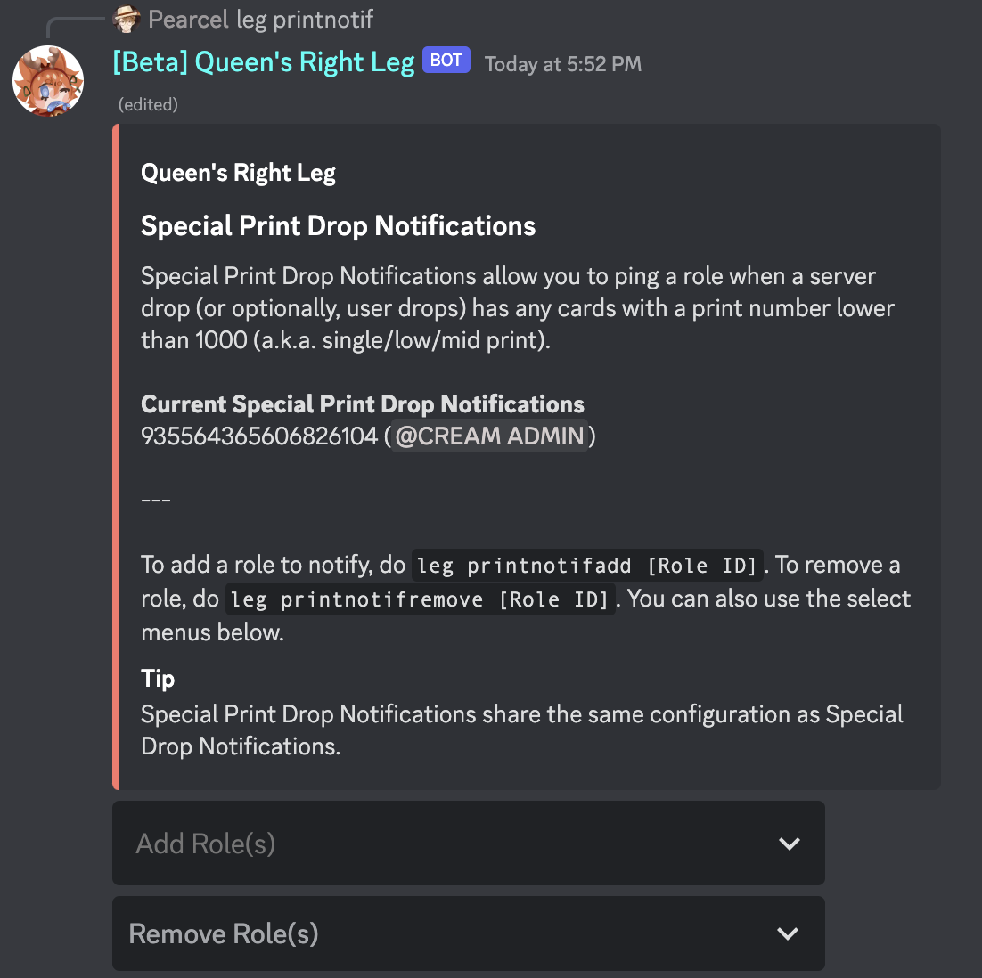 Special Print Drop Notifications allow you to ping a role when a drop contains a low/mid print card.